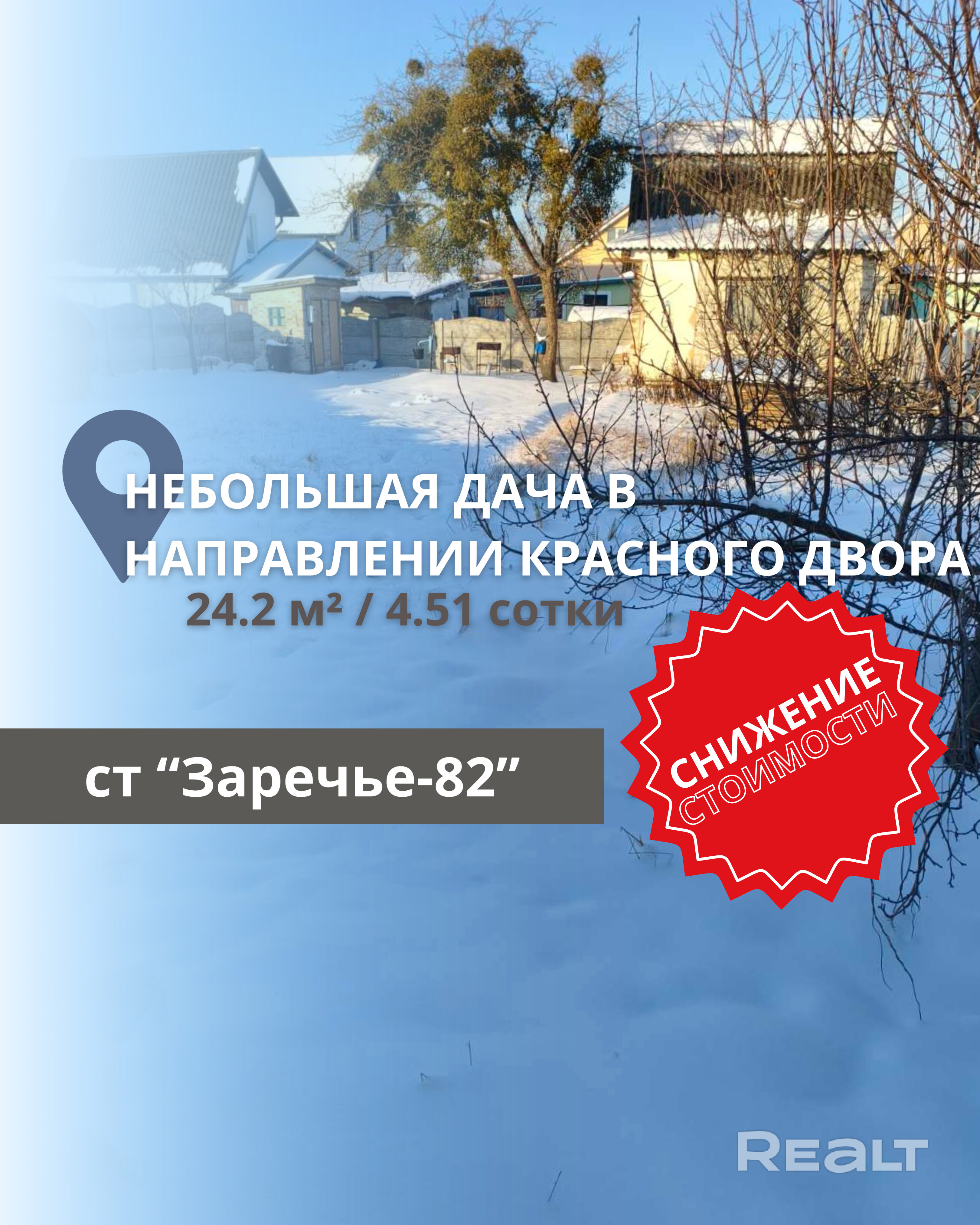 Продаётся дачный домик в садоводческом товариществе Заречье-82, расположенном в направлении Каменицы-Жировецкой, Мухавецкий сельсовет, Брестский район, Брестская область. Общая площадь дома составляет 24.2 кв.м, он был построен в 2014 году. Облицован кирпичом, крыша покрыта шифером. Газ проходит по улице, электричество в доме, вода из скважины. Санузел находится на улице. Участок площадью 4.51 сотки имеет правильную форму и огорожен бетонным забором, оснащён калиткой и воротами из металлопрофиля. Асфальтированная дорога ведёт к даче, рядом расположена автобусная остановка с маршрутом "Радуга". В непосредственной близости находятся дачное озеро и круглогодичный ларёк с необходимыми товарами, а также магазины Евроопт и озеро на Красном дворе.