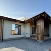Дом построен из газосиликатного блока с утеплением 10 см пенопласта. Фасад выполнен декоративной штукатуркой с мелкозернистой фактурой в серо-оливковом цвете. Архитектурное решение - сочетание природных оттенков с металлическими элементами «под дерево». Крыша - мягкая кровля коричневого цвета. Перекрытие утеплено более 20 см минеральной ваты, предусмотрены паро- и ветрозащита. Есть чердак с люк-лестницей со входом с террасы. Двухкамерные окна с бронзовым зеркальным остеклением. Два входа: основной и выход на террасу из гостиной. Высота потолков 2,8 м. Натяжные потолки с подсветкой и люстрами с пультами управления. Тёплые полы во всех зонах с плиткой; в трёх спальнях — ламинат и радиаторы с регулировкой температуры.