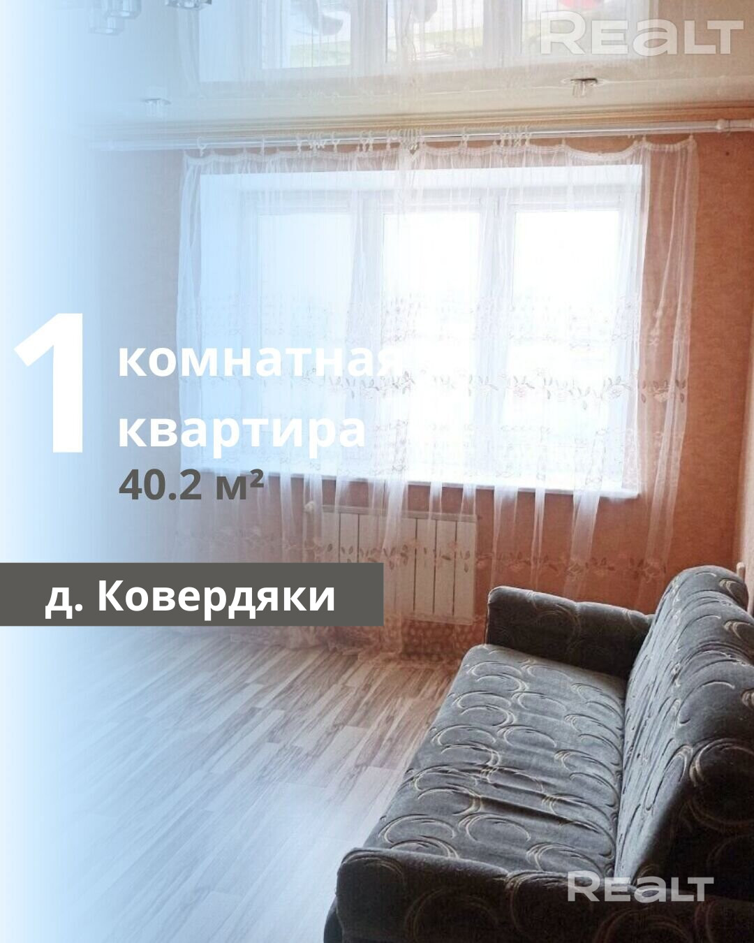 1-комнатная квартира в ближайшем пригороде Бреста, д. Ковердяки. Расположена на 4-м этаже 5-этажного кирпичного дома 2011 года постройки. Площадь 40,2 / 38,2 / 16,4 / 8,6 м2. Санузел раздельный, лоджия застеклена, автономный газовый котел в кухне (отопление и подогрев воды). Хороший ремонт: стеклопакеты, межкомнатные двери - МДФ, входная дверь металлическая, потоки - натяжные/снежка, полы - ламинат на стяжку, домофон. Чистый подъезд, тамбур на две квартиры. На площадке рядом с домом есть закрытое место для велосипедов. Во дворе парковка для автомобилей, начальная школа - сад, магазины, 3 минуты до остановки общественного транспорта (ходит 21 маршрутка), 15 минут до центра Бреста.