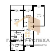 Общая площадь 81,0 кв.м, жилая площадь 53,7 кв.м. В соответствии с планировкой три жилые комнаты размещены по двум сторонам дома, самая просторная площадью 19,4 кв.м, кухня 9,1 кв.м, санузел раздельный и прихожая. Две застекленные лоджии из зала и спальни.