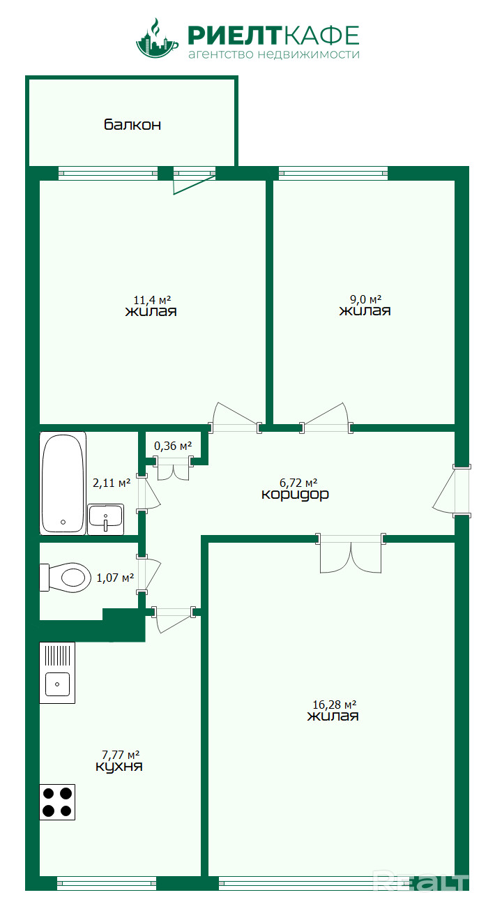 Общая площадь – 54,71 м2, жилая площадь – 36,68 м2, кухня – 7,77 м2.
