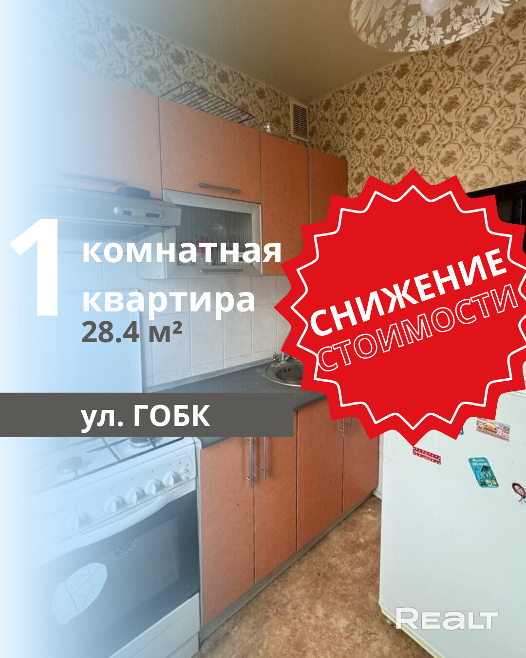Продается однокомнатная квартира по улице ГОБК общей площадью 28,4 м2, из которых жилая площадь составляет 13,7 м2, а кухня — 5,3 м2. Квартира расположена на 4 этаже 4-этажного кирпичного дома, построенного в 1954 году. Состояние квартиры — без ремонта, но она пригодна для проживания. Возможен торг.