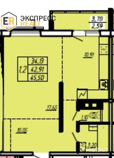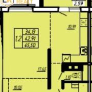 Площадь по СНБ 45,50 м2, Общая площадь 42,91 м2, жилая площадь 34,17 м2, из них кухня 10,91 м2.