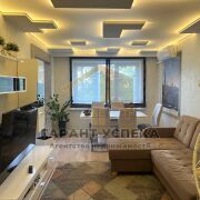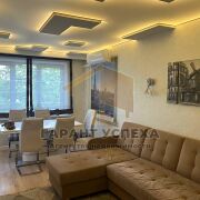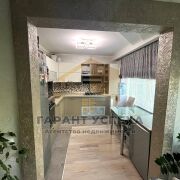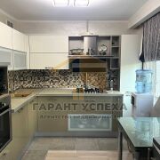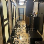 Для оформления интерьера использована контрастная цветовая палитра, сделан прогрессивный ремонт: потолки из гипсокартона с разноплановой системой освещения (2,50 м), полы - ламинат, плитка, в коридоре – наливной, стены оклеены обоями, декоративно окрашены. Санузел облицован керамической плиткой новой коллекции, акриловая угловая ванна. Кондиционер остается по договоренности. Кухонный гарнитур, варочная поверхность и вытяжка определяют функциональное рабочее пространство кухни. Мебель в прихожей – удобная система хранения.