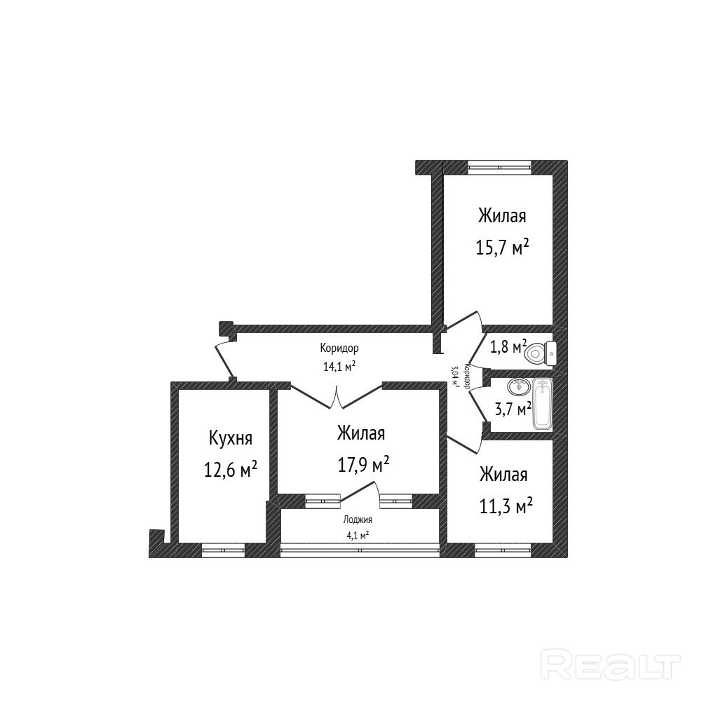 - Комнаты: 15,7 / 11,3 / 17,9 м2.