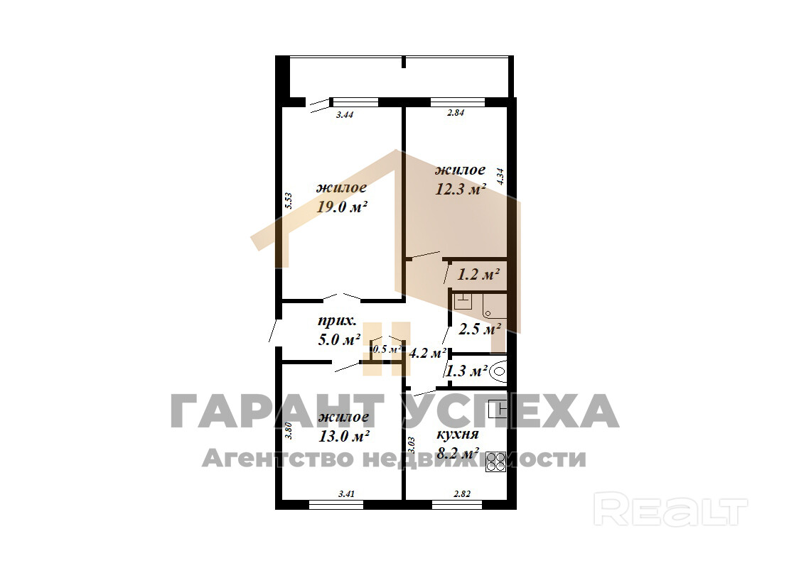 Квартира удобной планировки: три изолированные комнаты, самая просторная 19,0 кв.м, лоджия с выходом из зала, кухня - 8,2 кв.м, кладовая, раздельный санузел. Есть подвал. Квартира расположена на две стороны. Двускатная крыша.