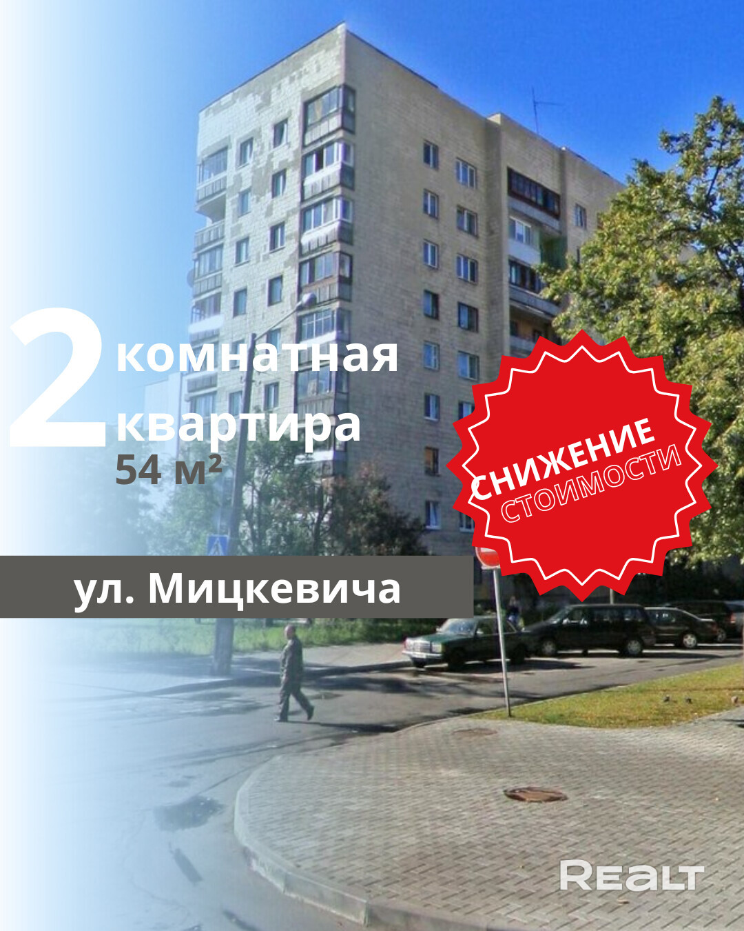 Продается 2-комнатная квартира в центре города Брест, расположенная на улице Мицкевича (пересечение с Кирова). Квартира 1977 года постройки, находится на первом этаже девятиэтажного кирпичного дома. Общая площадь составляет 54 кв.м.