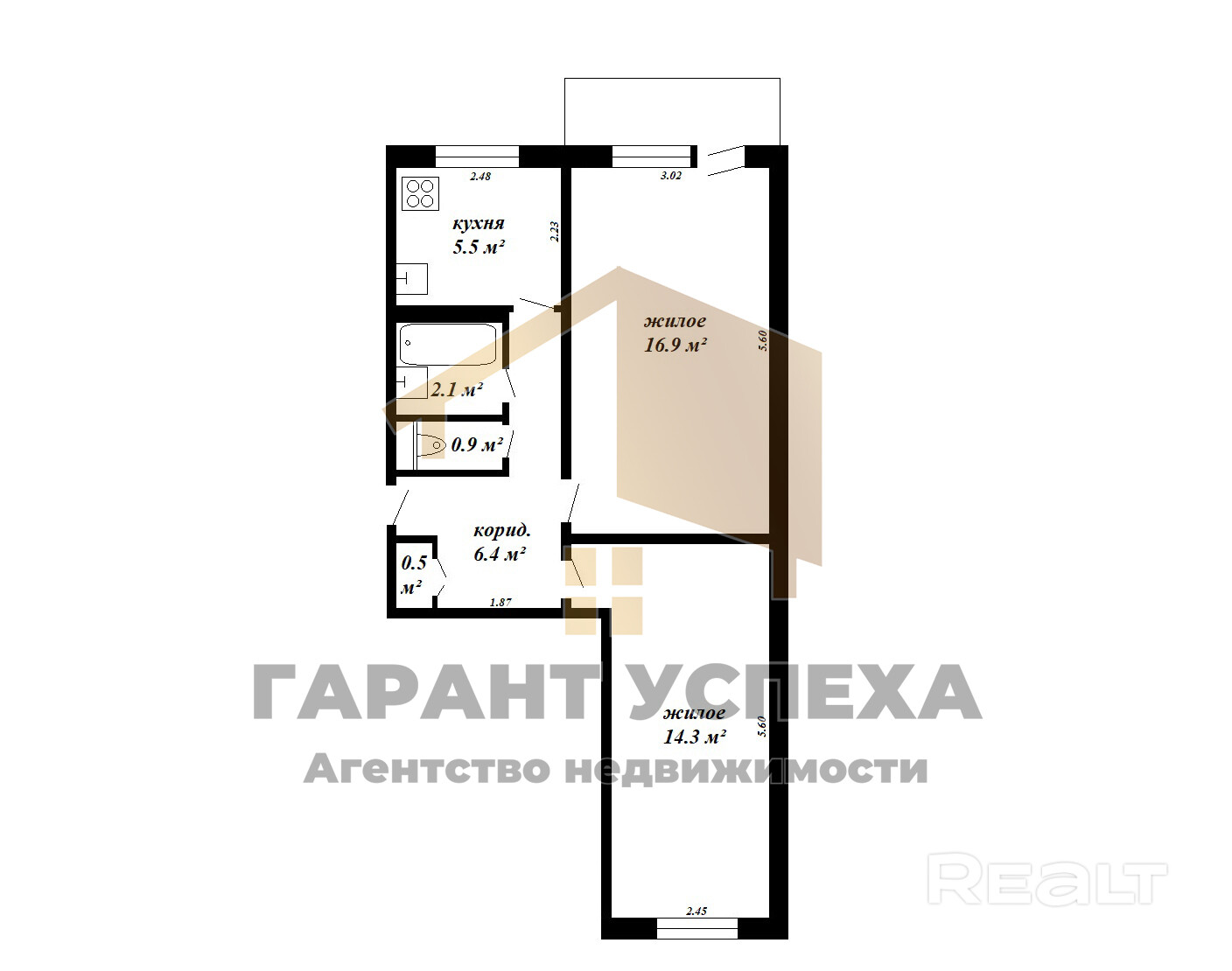 Общая площадь квартиры составляет 46,6 м2 (по СНБ – 47,4 м2), жилая – 31,2 м2, кухня – 5,5 м2.