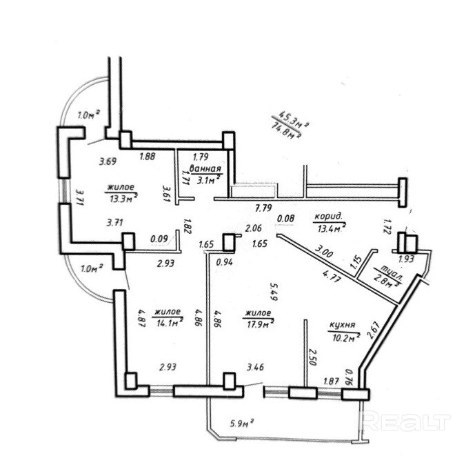 Блочный дом 2009 года постройки. 4 этаж из 13. Общая площадь квартиры по СНБ (с тремя балконами): 82,7 м2, общая площадь: 74,8 м2, жилая: 45,3 м2, кухня: 10,2 м2. Комнаты: 14,1 + 13,3 м2, кухня-столовая 28,1 м2 зонирована барной стойкой имеет выход на просторный балкон 5,9 м2. Так же имеется ещё два балкона с выходом из спален. Раздельный с/у, в туалете оборудована душевая кабина и раковина, в ванне установлен бойлер на 30л.
