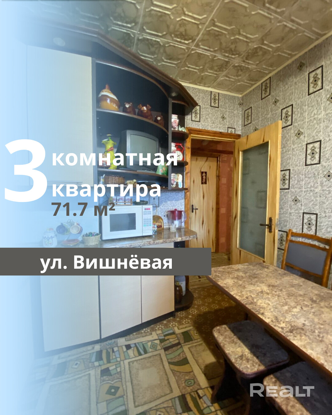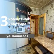 Продается светлая и уютная 3-комнатная квартира на ул. Вишнёвая, расположенная в панельном доме 1992 года постройки. Квартира находится на 5 этаже 9-этажного здания и имеет общую площадь 71,7 м2, из которых жилая площадь составляет 31,8 м2, а кухня — 9,3 м2. Санузел раздельный. Просторный коридор оснащен встроенными кладовыми, а также есть две застекленные лоджии с выходом из кухни и одной из комнат.
