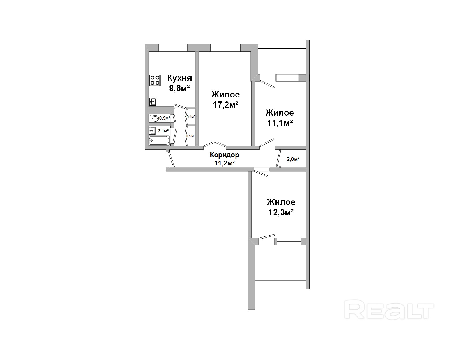 Трехкомнатная квартира на четвертом этаже 5-этажного панельного дома 1978 года постройки в центральной части города. Установлены стеклопакеты, окна выходят на разные стороны. Входная дверь – металлическая, межкомнатные - шпонированные. Общая площадь 71,7 кв.м, жилая 67,1 кв.м. Две спальни с лоджиями (застеклены стеклопакетами) расположены в конце коридора напротив друг друга, зал 17,2 кв.м. кухня 9,6 кв.м, санузел раздельный и коридор.