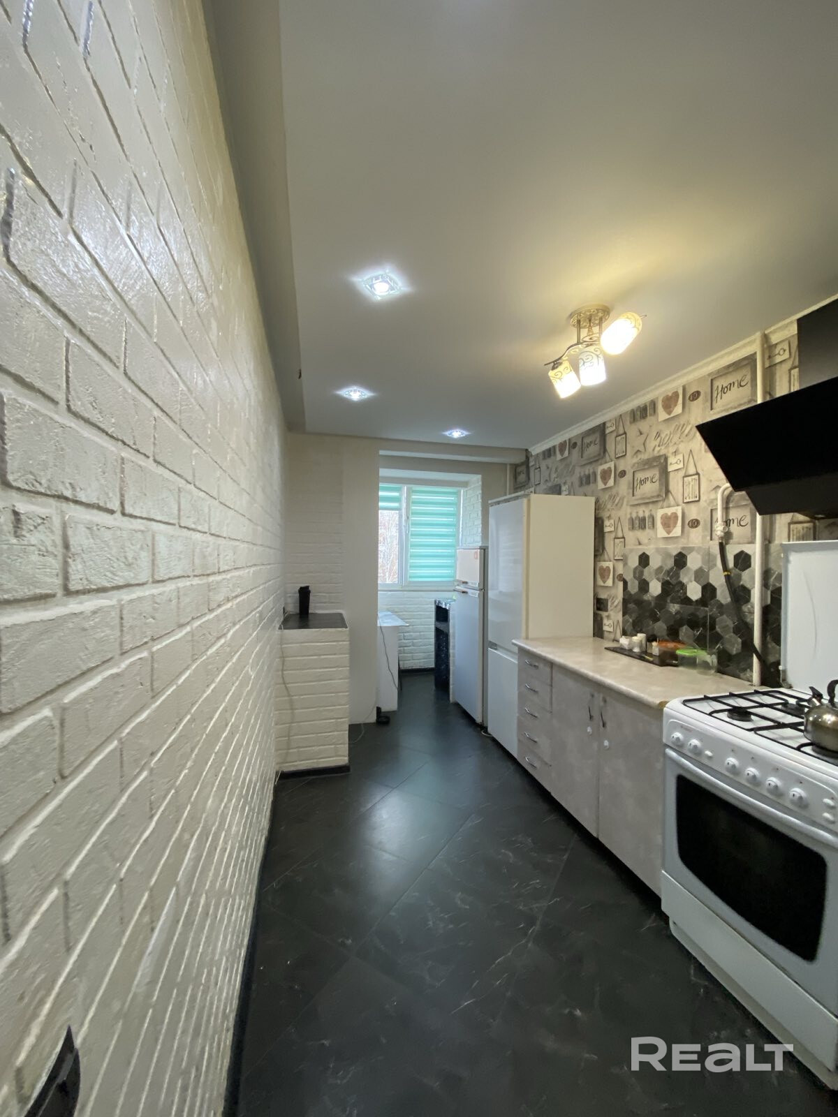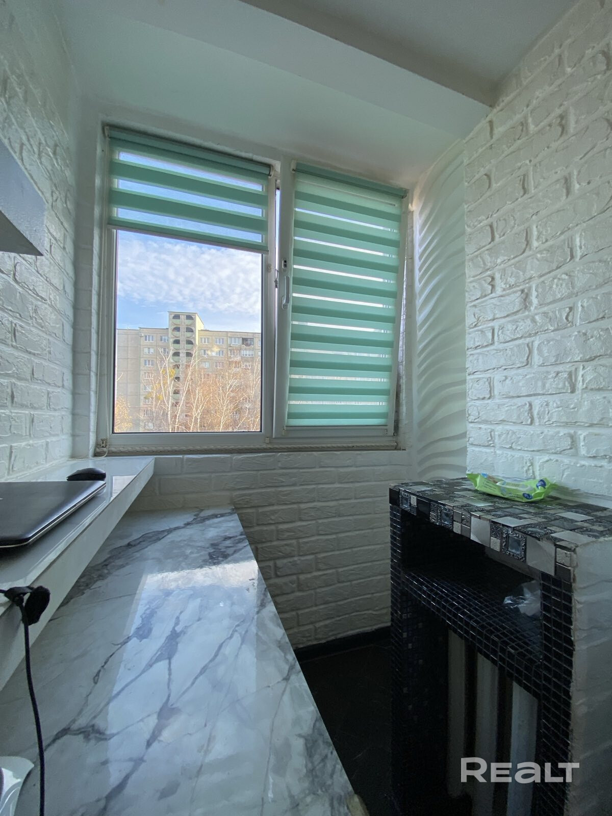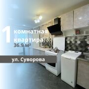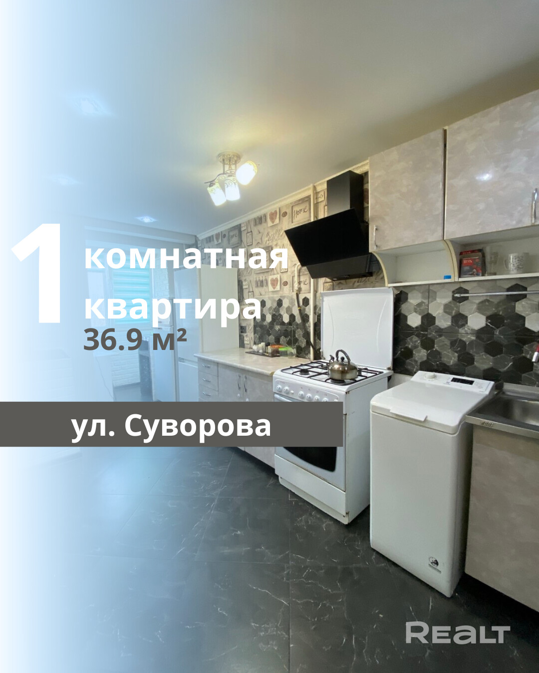 Продается светлая 1-комнатная квартира на улице Суворова в кирпичном доме 1988 года постройки. Квартира расположена на 3 этаже 9-этажного здания и имеет площадь 36,9 кв.м (жилая - 17,7 кв.м, кухня - 9,6 кв.м). Санузел совмещенный, имеется застекленная лоджия, которая оборудована под кабинет. В квартире хороший современный ремонт и удобная планировка. В ней установлены стеклопакеты и металлическая входная дверь. Натяжные потолки, полы из ламината в комнате и плитка в прихожей и кухне создают комфортную атмосферу. Стены оклеены обоями, в кухне дополнительно оформлены декоративным кирпичом, а в санузле используется современная плитка. Дополнительным преимуществом является наличие кладовой, которую можно использовать как гардеробную комнату. В доме чистый и аккуратный подъезд с одним пассажирским лифтом. Во дворе предусмотрена парковка для автомобилей. Удобное расположение дома позволяет пользоваться всеми преимуществами развитой инфраструктуры: в шаговой доступности находятся супермаркеты "Мартин" и "Евроопт", аптека, школа, детский сад, рынок Лагуна и другие объекты сферы обслуживания. Также имеется хорошая транспортная развязка, остановка общественного транспорта находится рядом.