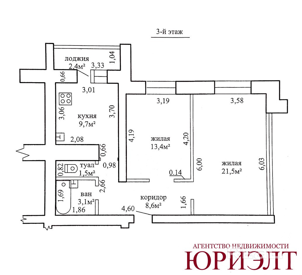 Кухня – 9,7 м2 с выходом на застекленную лоджию.