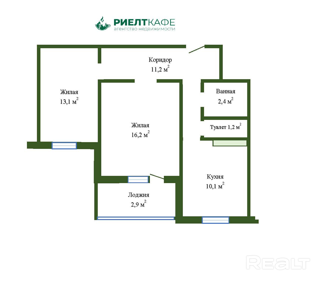 Общая площадь – 57,9 кв.м, жилая - 29,3 кв.м, кухня - 10,1 кв.м.