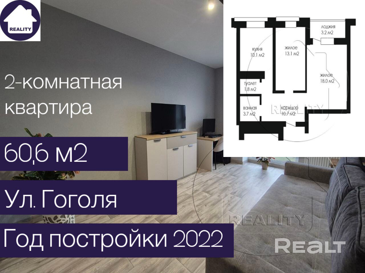 Предлагаем купить светлую, просторную 2-х комнатную квартиру в центральной части города по ул. Гоголя 2022 г. п. 15/18 (прекрасный вид из окон) этажного монолитного дома с раздельным санузлом, застекленной лоджией. Общая площадь по СНБ – 60,6 кв. м, общая площадь -57,4 кв. м., жилая – 31,1 кв. м., кухня – 10,1кв. м.