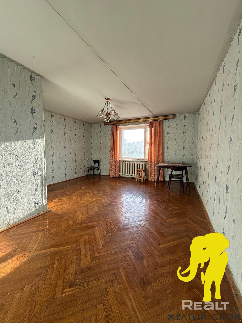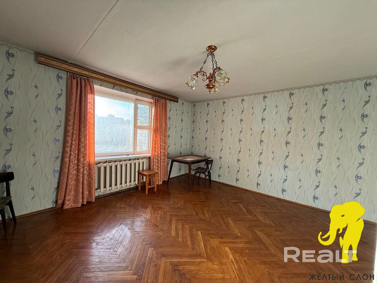 Окна деревянные. Потолок побелен. На полу паркет. Стены - обои.