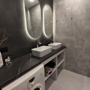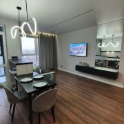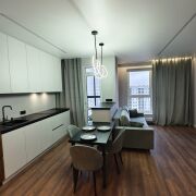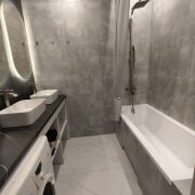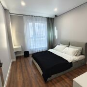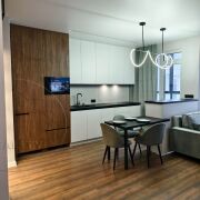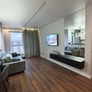 В отделке использовались современные, премиальные материалы. Металлическая входная дверь, современная мебель в приятных тонах, вся техника встроенная (посудомоечная машина, микроволновая печь, холодильник), есть телевизор, стиральная машина, кондиционер.