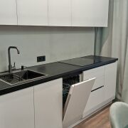 Кухонная мебель включает встроенную технику: варочную панель, вытяжку, посудомоечную машину, микроволновую печь и встроенный холодильник. В квартире подключено устройство "Алиса".
