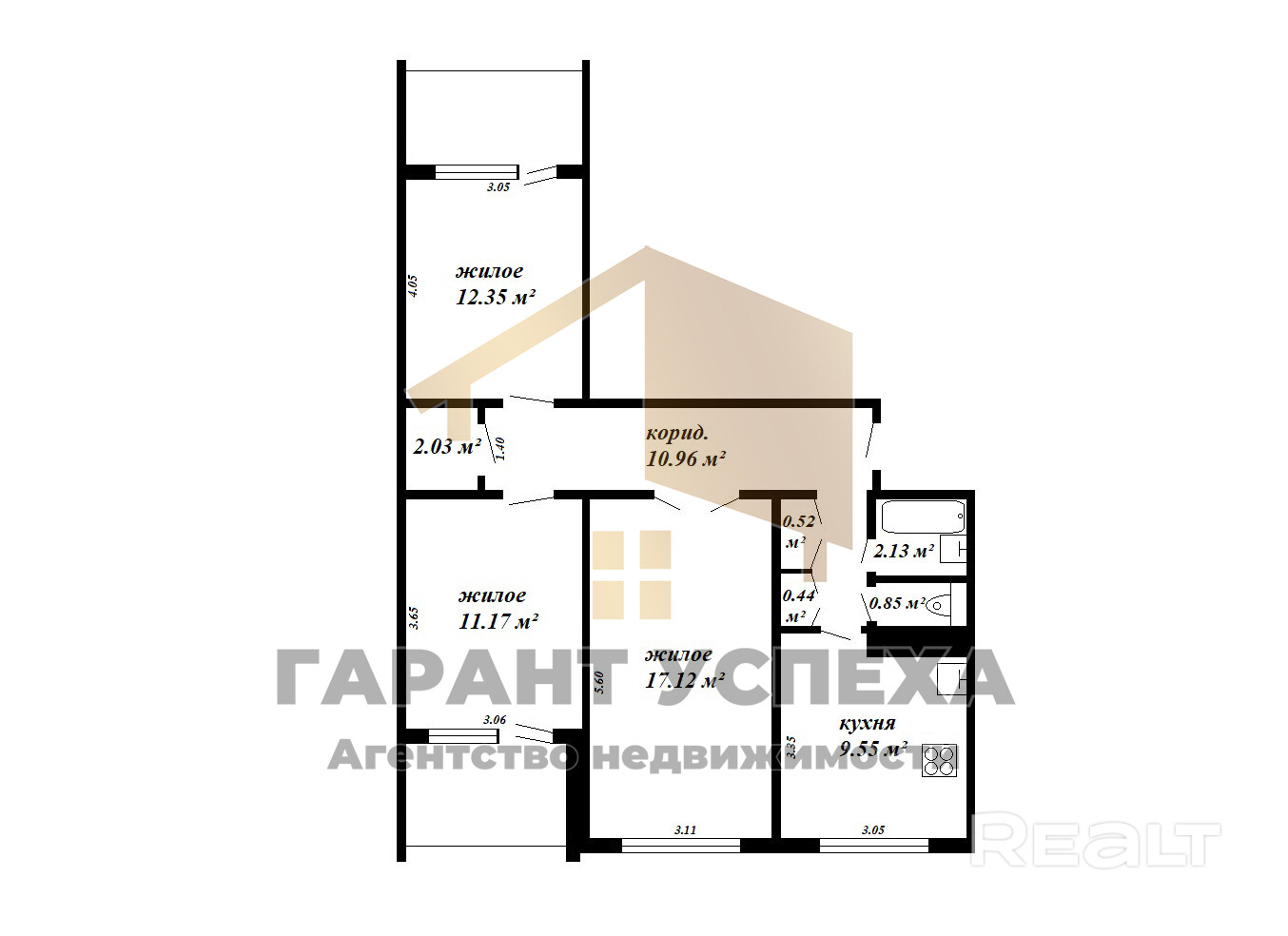 Удобная планировка: три жилые изолированные комнаты (17,2 м2, 11,2 м2 и 12,35 м2), раздельный санузел.