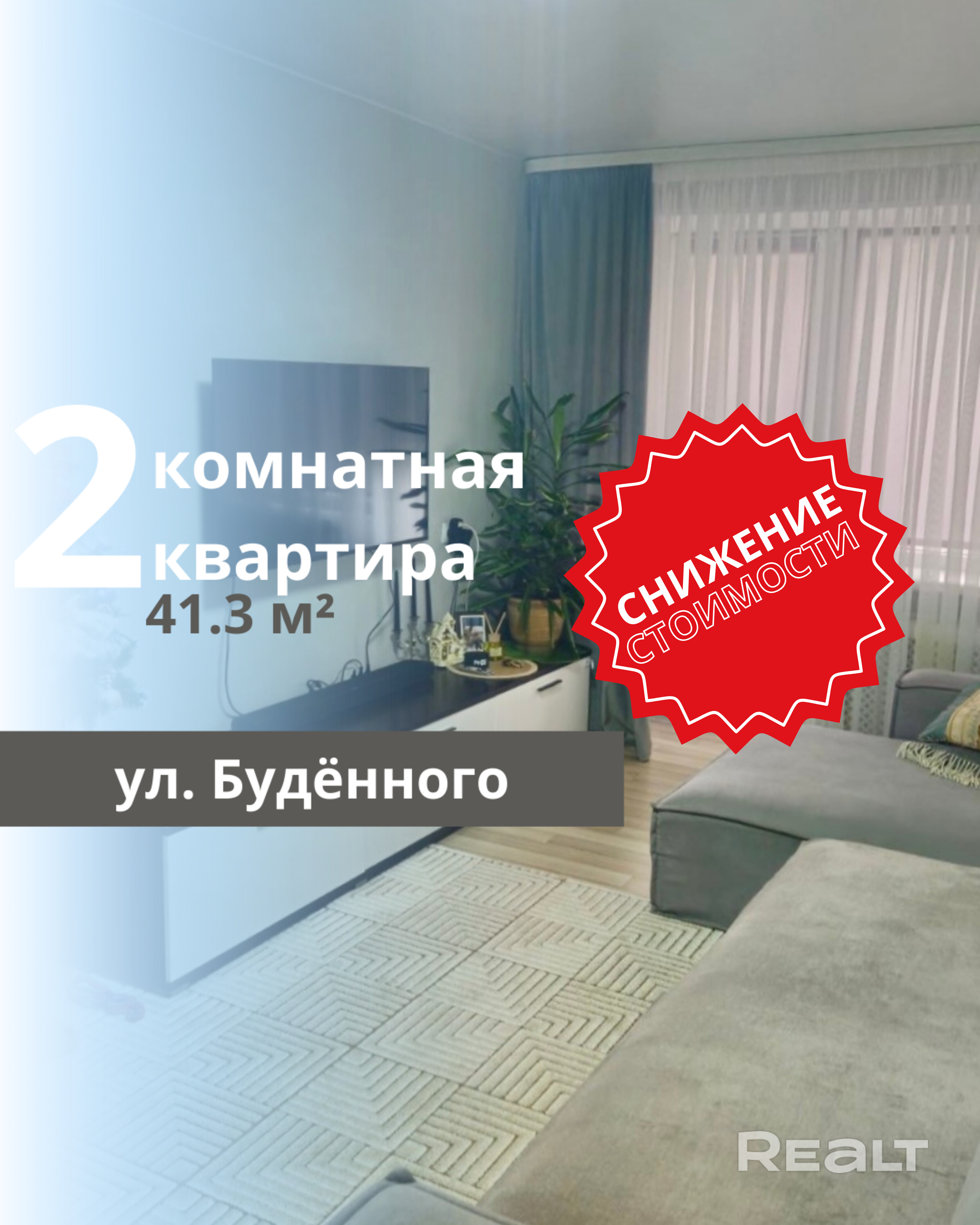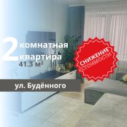 Продается 2-комнатная квартира на ул. Буденного, 1967 года постройки, расположенная на 4 этаже 5-этажного кирпичного дома. Общая площадь квартиры составляет 41,3 м2, жилая – 26,2 м2, кухня – 26,2 м2, в квартире есть балкон и подвал. В квартире совмещенный санузел. Выполнен качественный ремонт: стеклопакеты, межкомнатные двери из МДФ, металлическая входная дверь, натяжные потолки с разнообразной системой освещения. Полы выложены ламинатом на стяжку, стены оформлены декоративной имитацией кладки в коридоре и кухне, а также обоями. В санузле – современная плитка, заменены сантехнические трубы, проведена новая электропроводка (частично). Установлен домофон. В комплекте остаются кухонный гарнитур, варочная поверхность, встроенный шкаф в зале и диван. Квартира с хорошим ремонтом и чистым подъездом. В шаговой доступности находится пешеходная улица Советская, торгово-развлекательные объекты и отличное транспортное сообщение.