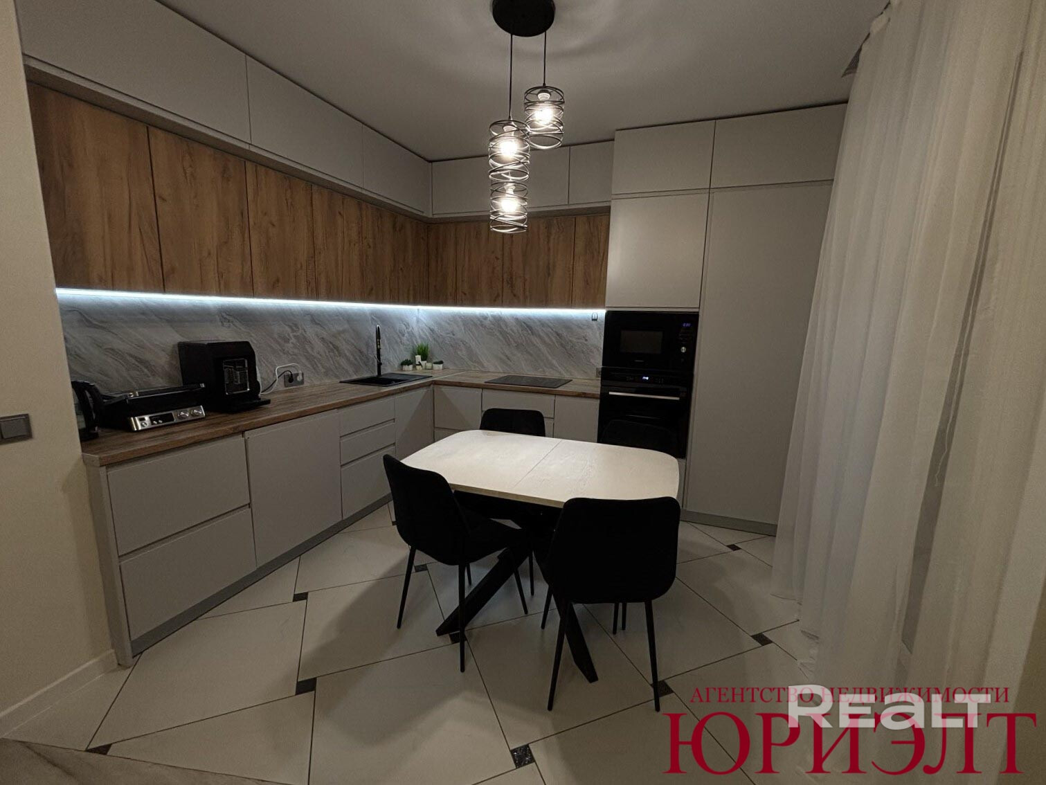 Кухонный гарнитур в светлых тонах, укомплектован всей необходимой техникой.