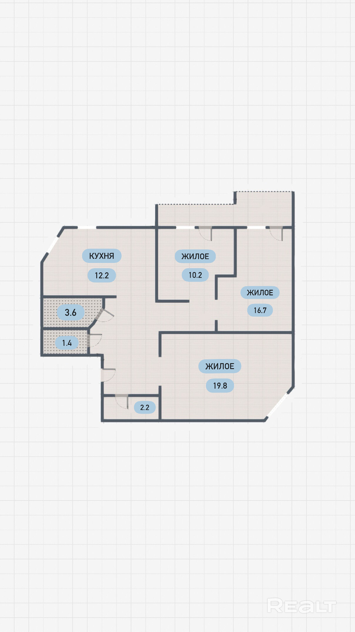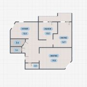 Общая площадь квартиры составляет 84,4 м2, жилая – 46,7 м2, кухня – 12,2 м2.
