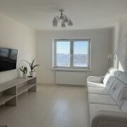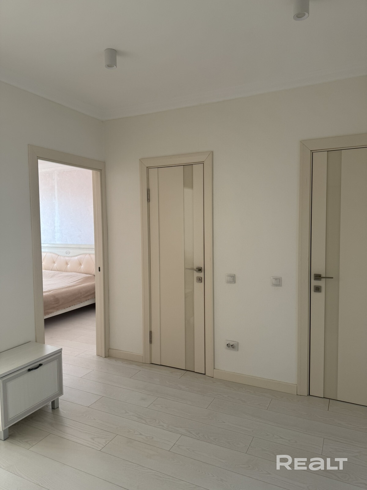 зал - стены и потолки - покраска водоэмульсионной краской. Полы - светло-бежевый австрийский ламинат. Итальянская сантехника. Из мебели - прихожая новая, кухня б/у, стиральная машина новая.