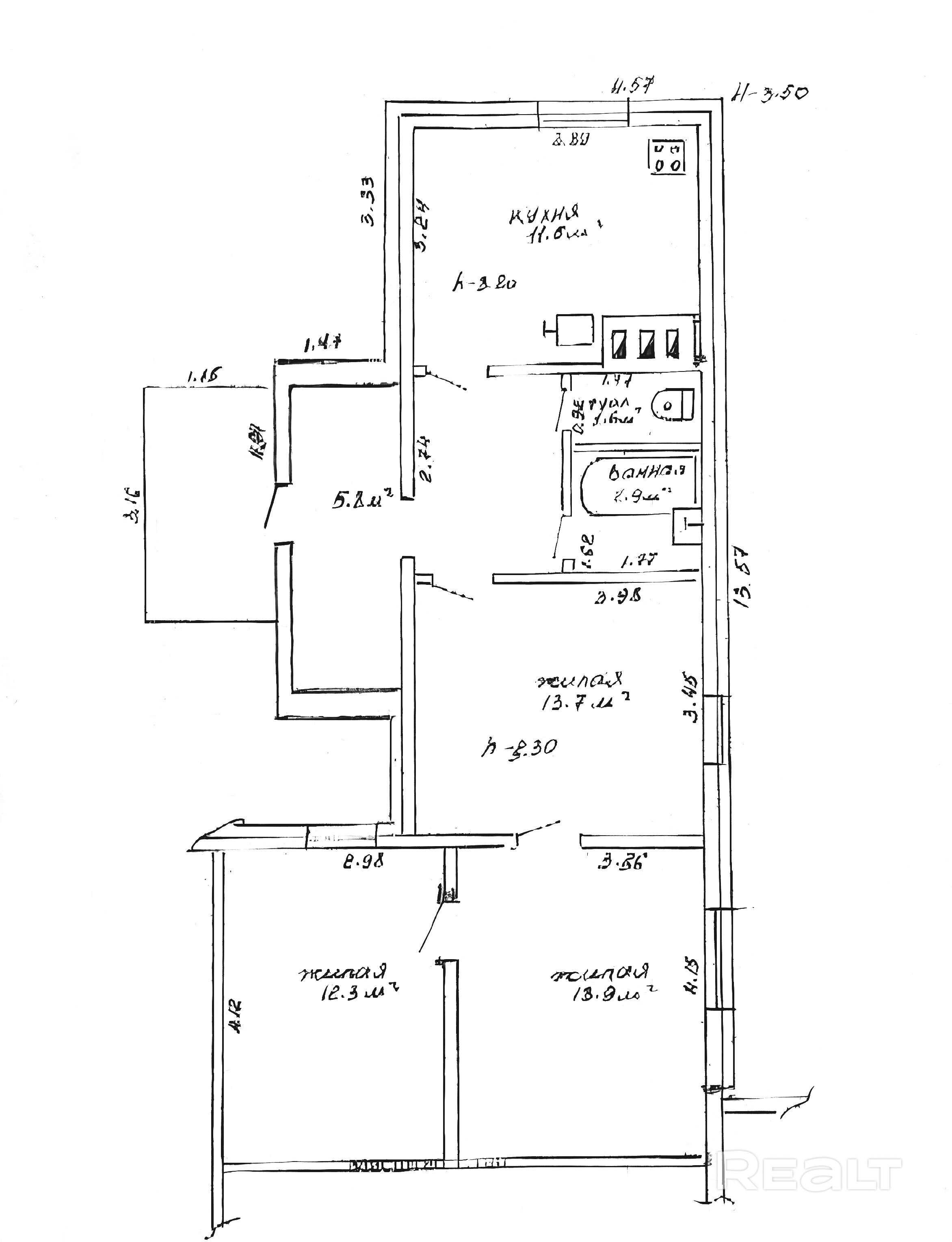 Общая площадь по СНБ - 67.2 м2, общая жилая – 61.4 м2, жилая – 39.9 м2, кухня - 11.5 м2.