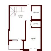 На первом этаже расположены: тамбур, кухонная зона (14,7 кв.м.), гостиная (21,8 кв.м.) и санузел (4,2 кв.м.).