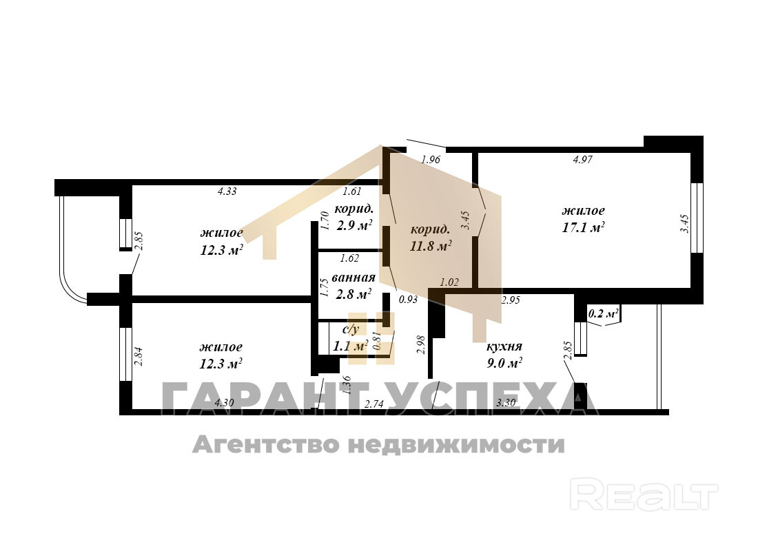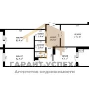 Удобная планировка: три жилые комнаты (12.3 м2, 12.3 м2, 17.1 м2), просторная кухня (9.0 м2), раздельный санузел, две застекленные лоджии.