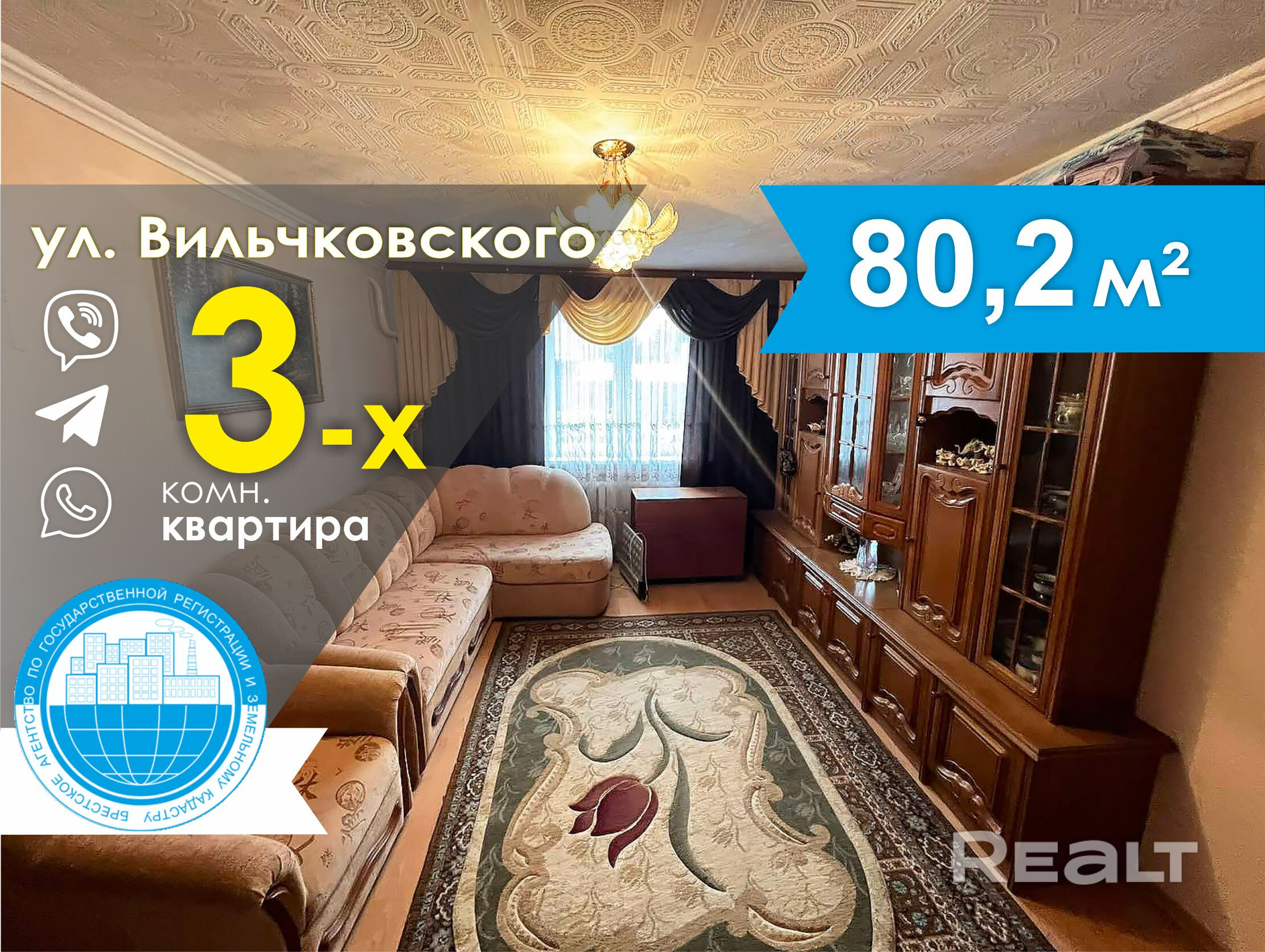 Продается просторная трехкомнатная квартира в блокированном многоквартирном жилом доме по ул. Вильчковского. Идеальный вариант для тех, кто ценит комфорт, уют и немного личного пространства на свежем воздухе.  Дом кирпичный, одноэтажный, крыша шифер. Общая площадь квартиры СНБ - 80,2 кв.м, жилая – 41,6 кв.м, кухня – 16,5 кв.м. Имеются все коммуникации: водопровод, газоснабжение и канализация – центральные, отопление газовое. Установлен газовый котел и колонка для подогрева воды. Окна – ПВХ, на полу – линолеум, ламинат, в с/у – плитка.