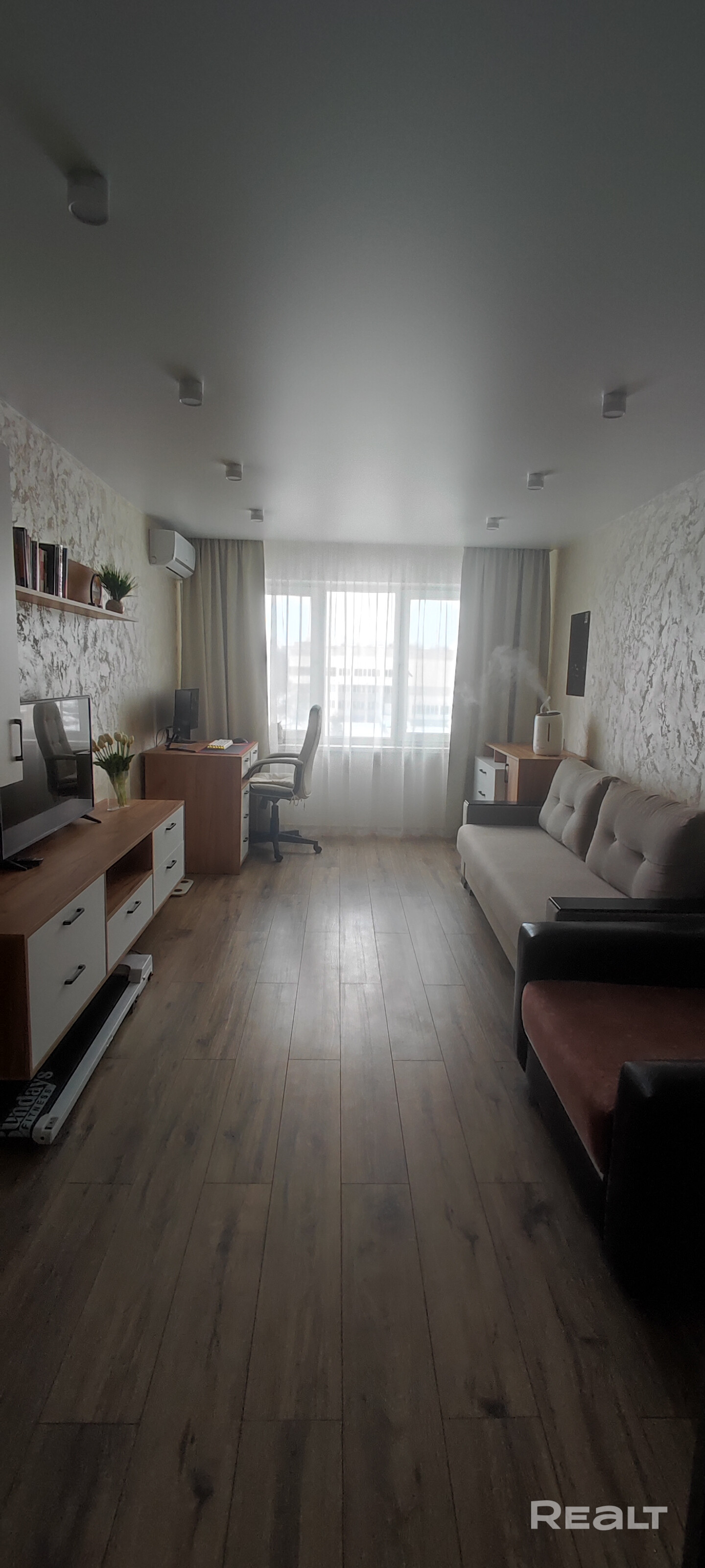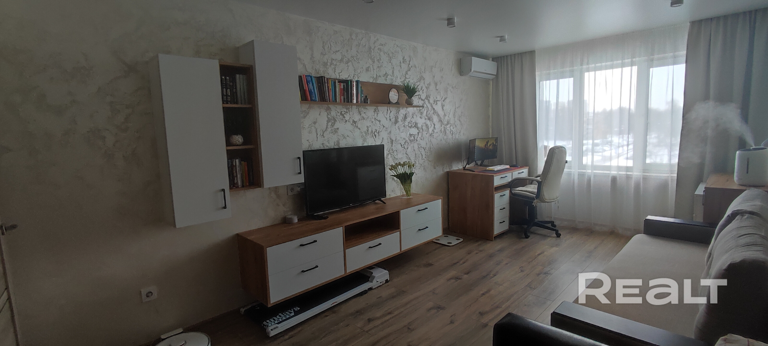 Стеклопакеты,межкомнатные двери-экошпон,натяжные потолки во всей квартире,полы-плитка,в комнате ламинат.Стены в декоративной отделке(кирпич,декоративная штукатурка),в саунзле и ванной современная плитка,заменен полотенцесушитель.Кондиционер в комнате. В квартире остаётся:кухня,встроенный кухонный гарнитур(духовой шкаф,варочная панель,посудомоечная машина)вся мебель в ванной и санузле,мебель в кладовой,шкаф-купе,стенка в комнате.Квартира с хорошим ремонтом, полностью готова в проживанию.