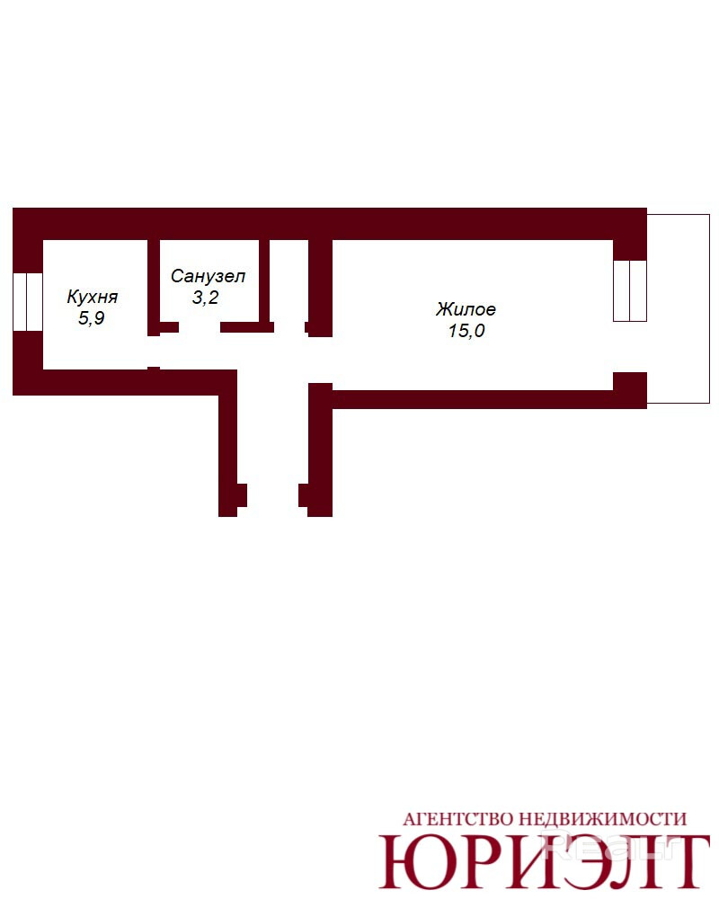 Общая площадь 30.9 кв.м, жилая - 15 кв.м, кухня - 5.9 кв.м, из комнаты входит застекленный балкон. Высота потолков - 2.53 метра.