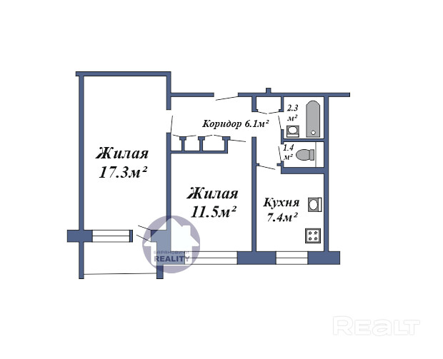 * Санузел: раздельный – 2.3 кв.м./ 1.4 кв.м.