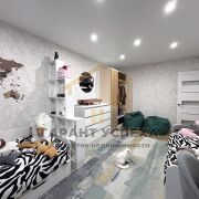Гостиная — просторная и светлая, оборудована вместительной современной горкой (белый глянец + дерево) и большим шкафом‑гардеробом с текстурой под натуральный камень. Окна — ПВХ.