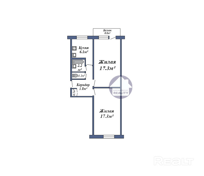 * Санузел: раздельный – 2.2 кв.м./ 1.2 кв.м.;