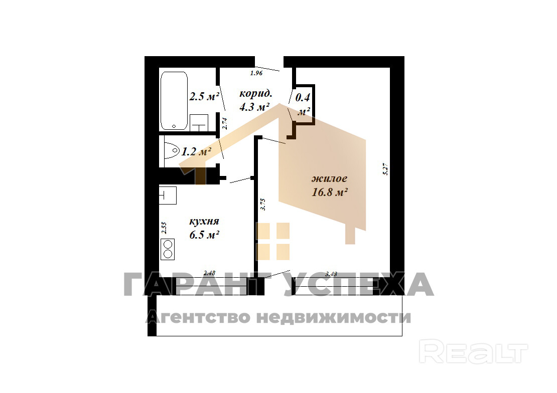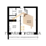 Квартира удобной планировки: просторная комната с нишей - 16,8 кв.м, застеклённый балкон - 5,7 кв.м, кухня - 6,5 кв.м, раздельный санузел, коридор - 4,3 кв.м.