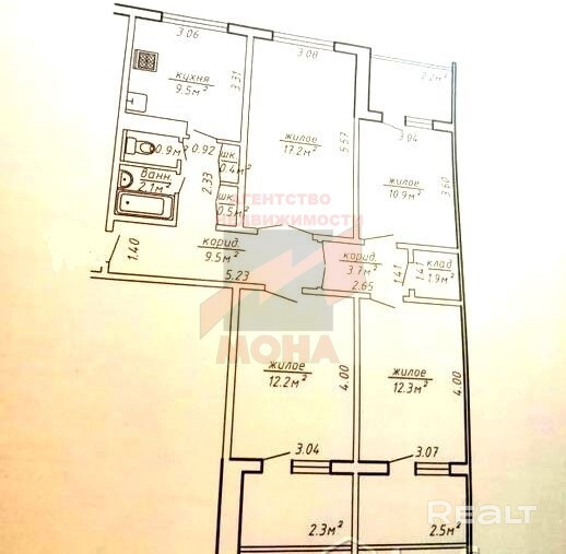 Общая площадь - 81,1 м2, жилая - 52,6 м2, кухня -12 м2. 4 этаж в 9-этажном панельном доме.
