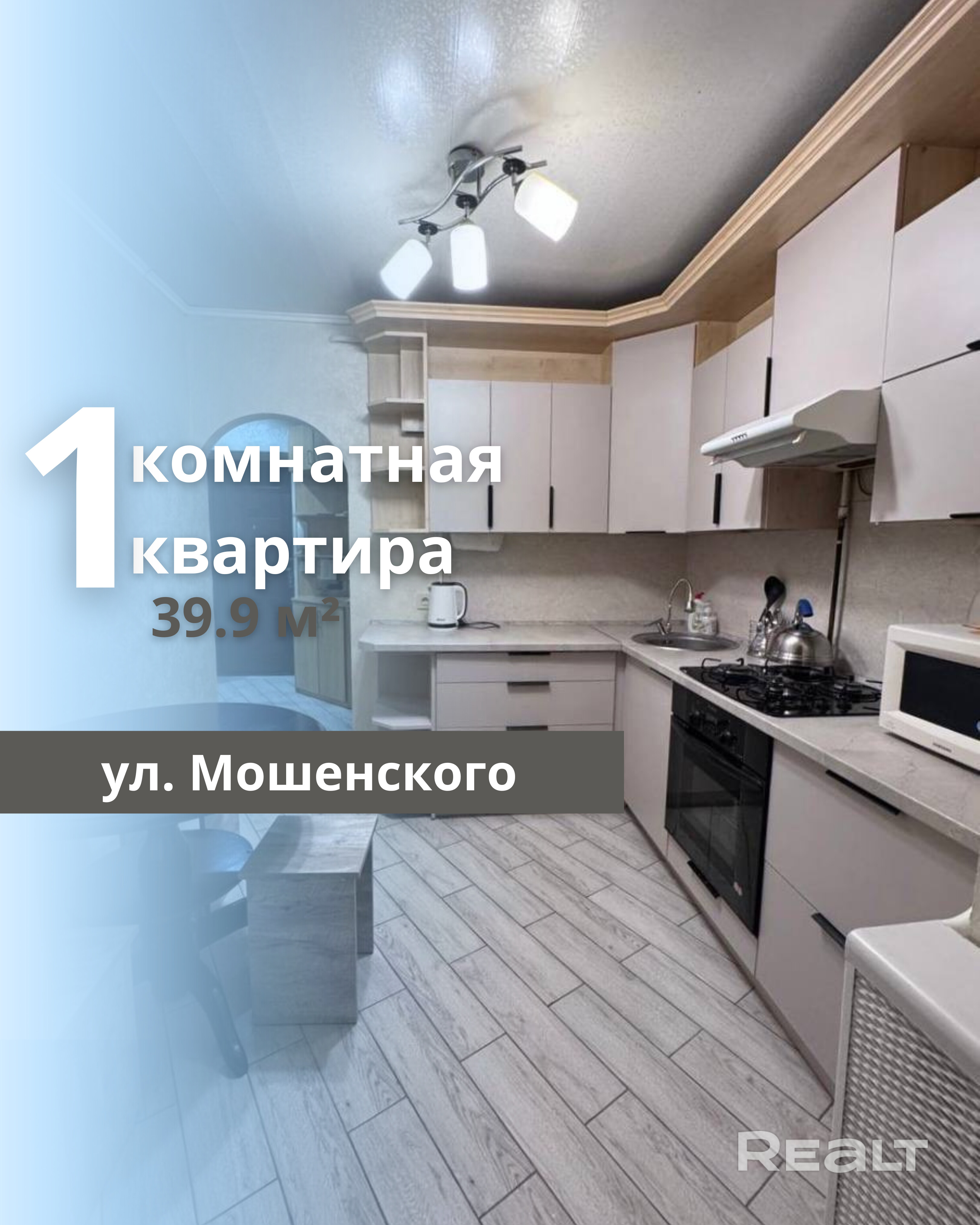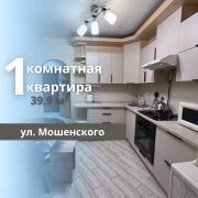 Предлагаем вашему вниманию современную 1-комнатную квартиру, полностью готовую к проживанию, расположенную по улице Мошенского в микрорайоне Берёзовка. Квартира находится в кирпичном доме 1996 года постройки на первом этаже пятиэтажного здания. Общая площадь квартиры составляет 39.9 м2, из которых большая жилая комната занимает 21.9 м2, кухня — 9.7 м2, а также имеется просторный коридор. Санузел раздельный. Квартира отличается удобной планировкой, а лоджия застеклена и утеплена, что делает её комфортной в любое время года. Внутри выполнен качественный ремонт: установлены новые сантехнические приборы, окна ПВХ, металлическая входная дверь, межкомнатные двери из массива, натяжные потолки и полы из ламината и плитки. В доме имеется домофон и система видеонаблюдения, подъезд чистый и ухоженный. На территории микрорайона расположено множество детских садов и школ, а также супермаркеты и торговый центр «Санта». Превосходная транспортная доступность обеспечивает легкость передвижения по городу. Эта квартира станет отличным выбором для комфортного проживания!