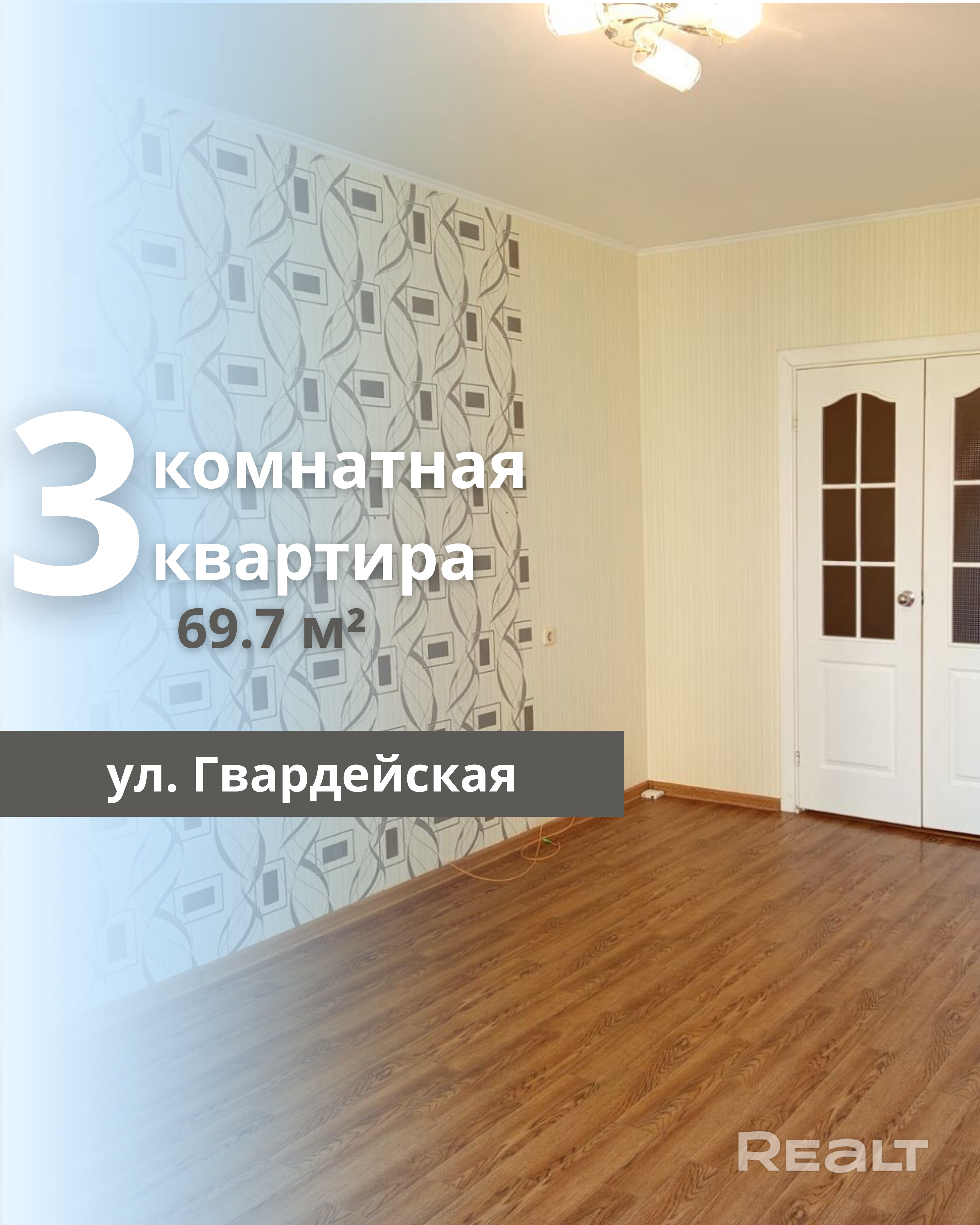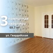 Продается 3-комнатная квартира в микрорайоне Южный на улице Гвардейская. Общая площадь квартиры составляет 69.7 м2, жилая площадь – 41.5 м2. Квартира расположена на 3 этаже 10-этажного панельного дома, построенного в 2010 году. Санузел раздельный, окна оборудованы стеклопакетами, межкомнатные двери выполнены из МДФ, а входная дверь – металлическая. Потолки выровнены и окрашены, полы покрыты линолеумом. В квартире две застекленные лоджии. Стены оклеены обоями. Это светлая и ухоженная квартира в отличном состоянии, находящаяся в прекрасной локации для жизни. В непосредственной близости расположен супермаркет Евроопт, а также остановки общественного транспорта, сад, школа и почта.