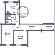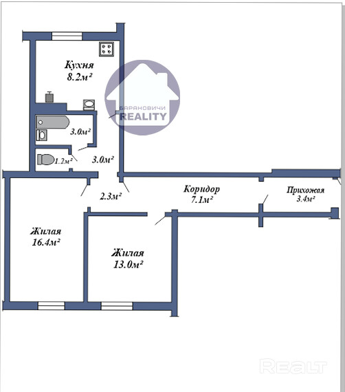 - 2 изолированные большие комнаты 16.4 кв.м. и 13.0 кв. м.;