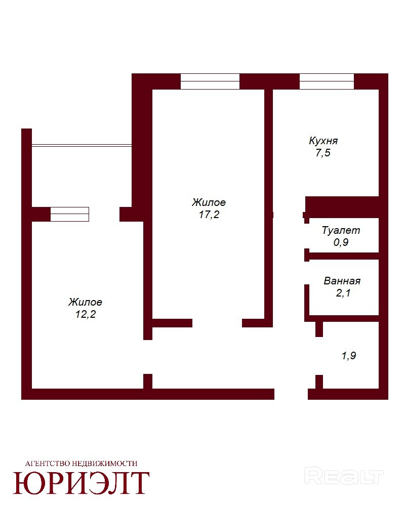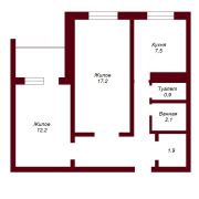 Общая площадь - 52,5 кв.м., жилая - 29,4 кв.м., кухня - 7,5 кв.м.