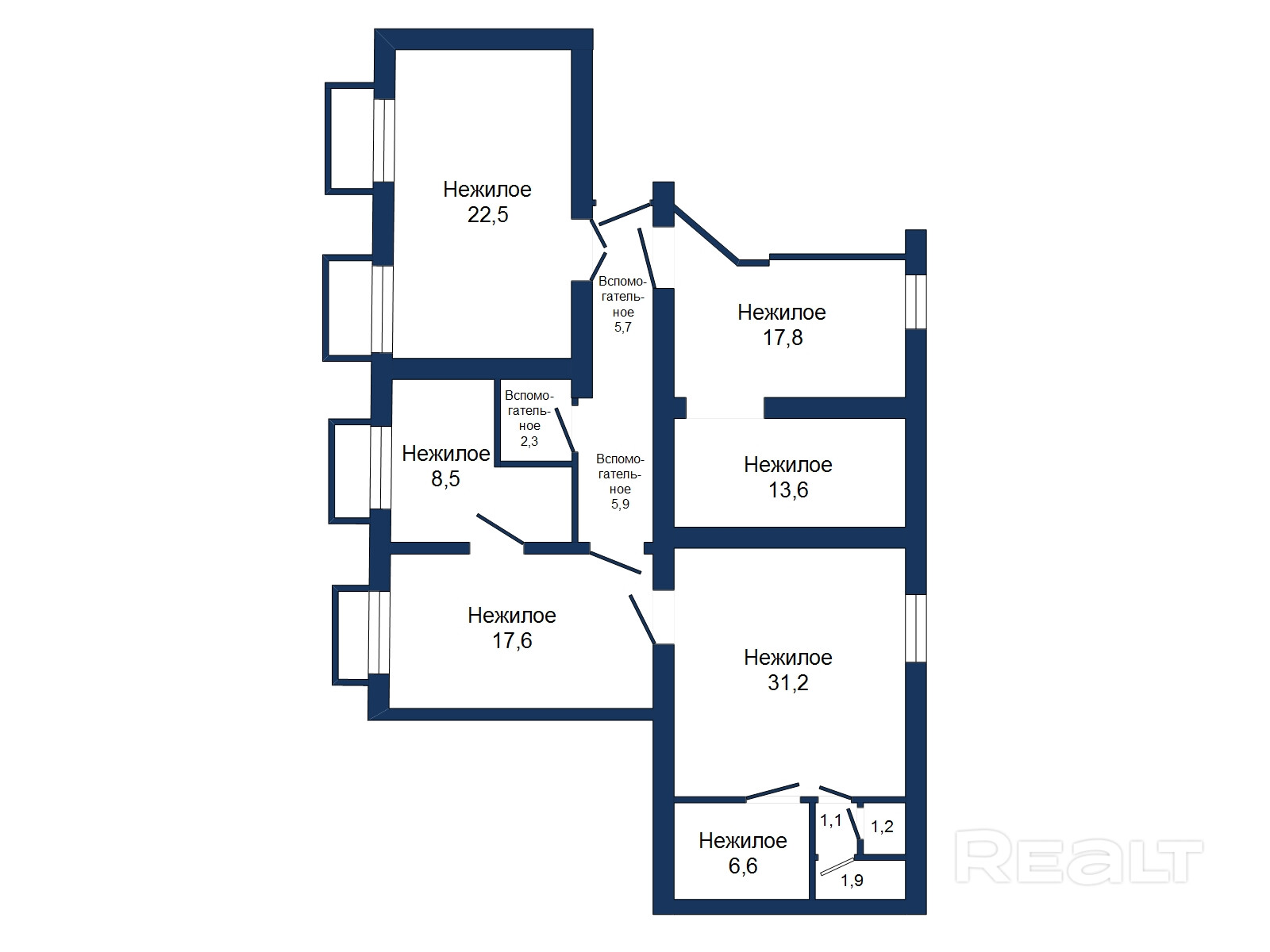 Нежилое помещение в Собственность, в центре г. Бреста, общей площадью 135,9 кв.м. Изолированное помещение с отдельным входом расположено в цокольном этаже многоквартирного жилого дома. Парковка перед зданием. Инженерно-технические коммуникации: водоснабжение - центральное; канализация - центральная; электроснабжение - 220В. Установлены индивидуальные приборы учёта электроэнергии и водоснабжения. Состоит из шести комнат площадью 22,5 кв.м., 8,5 кв.м., 17,6 кв.м., 17,8 кв.м., 13,6 кв.м., 31,2 кв.м. подсобное помещение - 6,6 кв.м., два коридора - 5,7 кв.м. и 5,9 кв.м. Два отдельных санузла - 2,3 кв.м. и 4,2 кв.м. Технические характеристики помещения: полы-плитка; окна- ПВХ профиль; двери- деревянные, металлические; стены- оштукатурены, окрашены. Оборудована пожарная сигнализация. Цена указана с НДС. Лот 250194