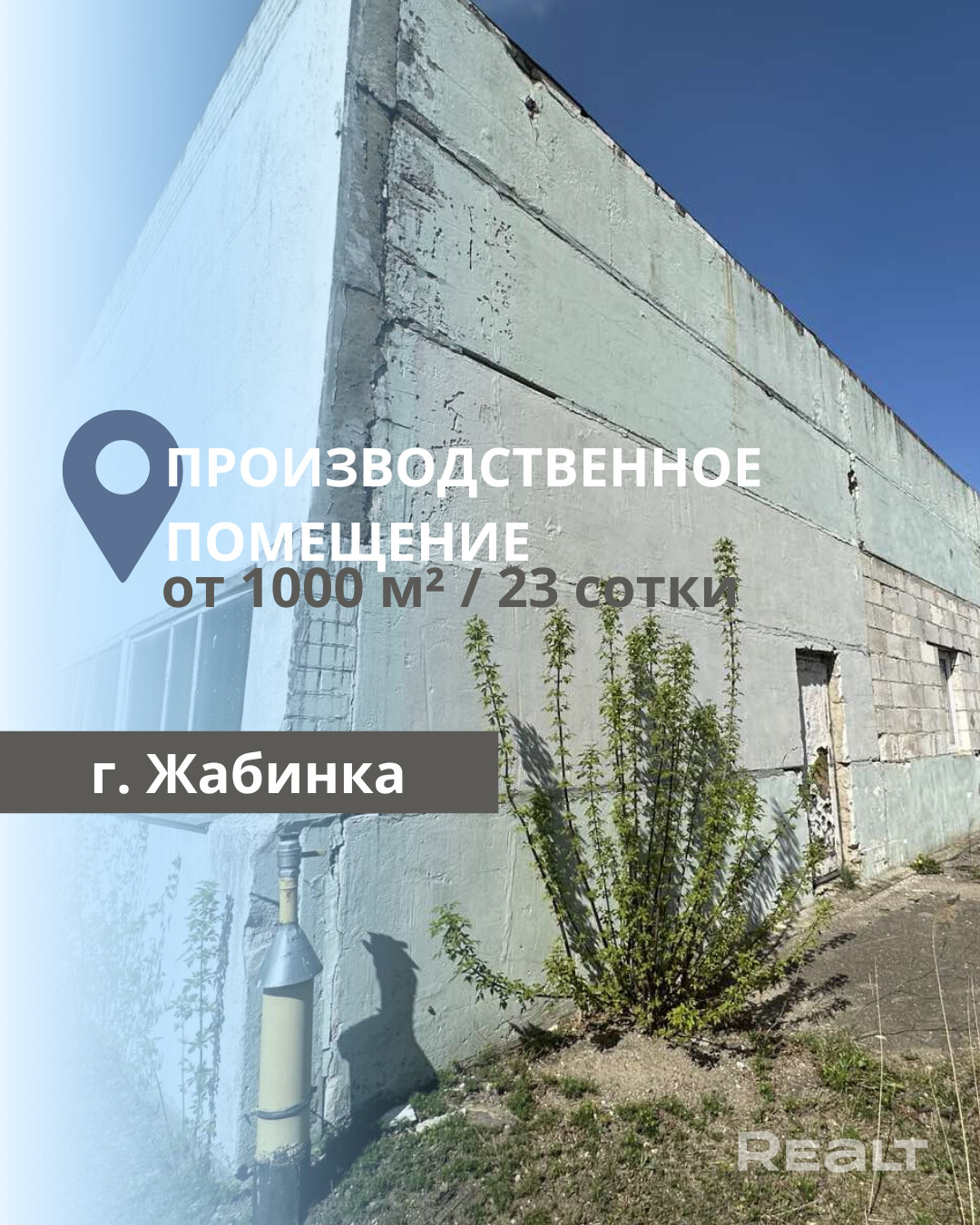 Отдельно стоящее производственно - бытовое помещение в городе Жабинка. Общая площадь 1089,1 кв. м. Высота потолков 4-6 м. Предполагается широкий спектр использования (производство, торговля, склад, административные помещения). Коммуникации: водоснабжение - центральное, канализация центральная, газ подведен к зданию, электричество центральное. Фундамент - бетонный, стены- панели/блок, полы - бетонные, перекрытия - железобетонные плиты, окна- ПВХ. Здание расположено на земельном участке 0,23 га