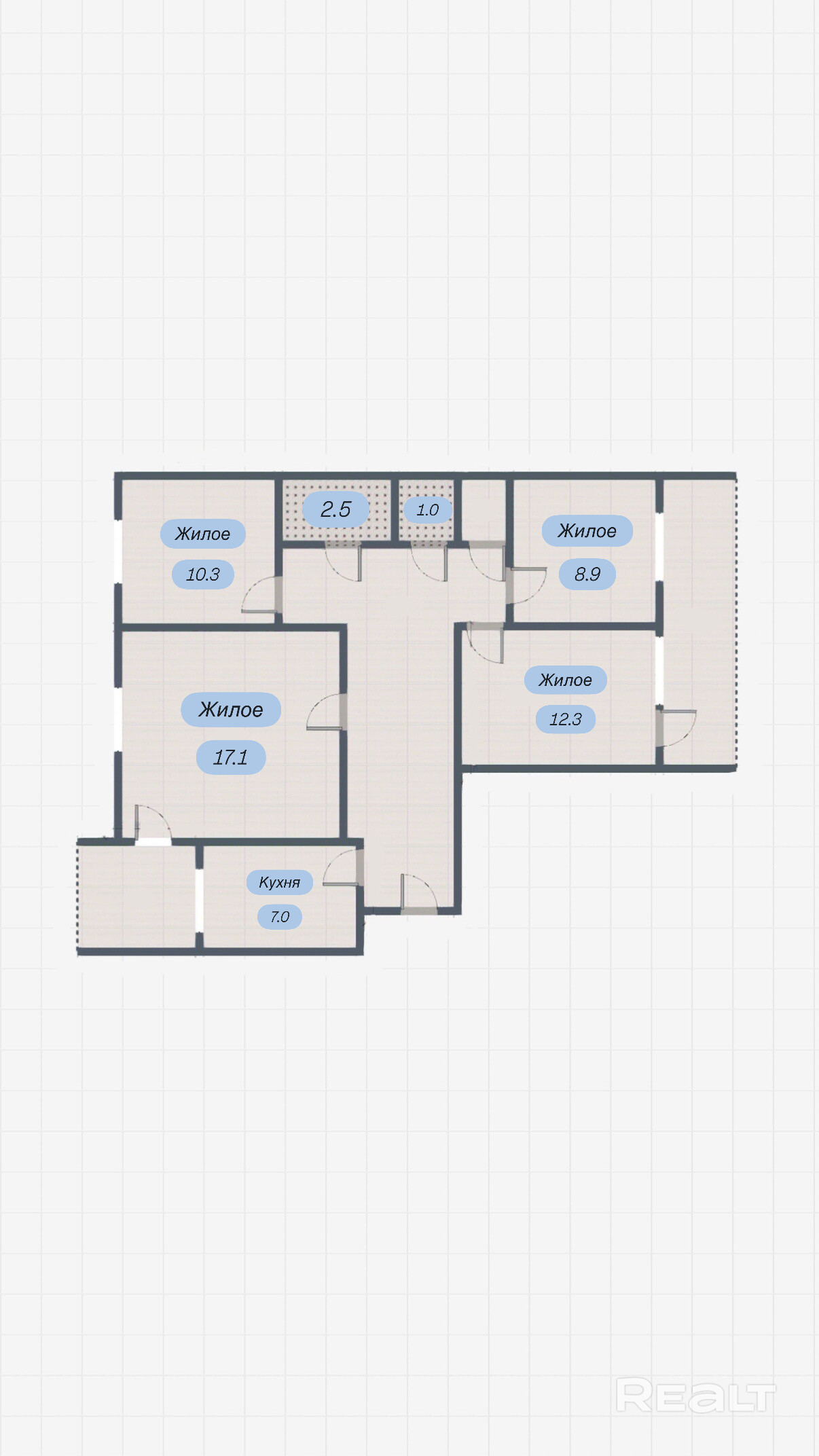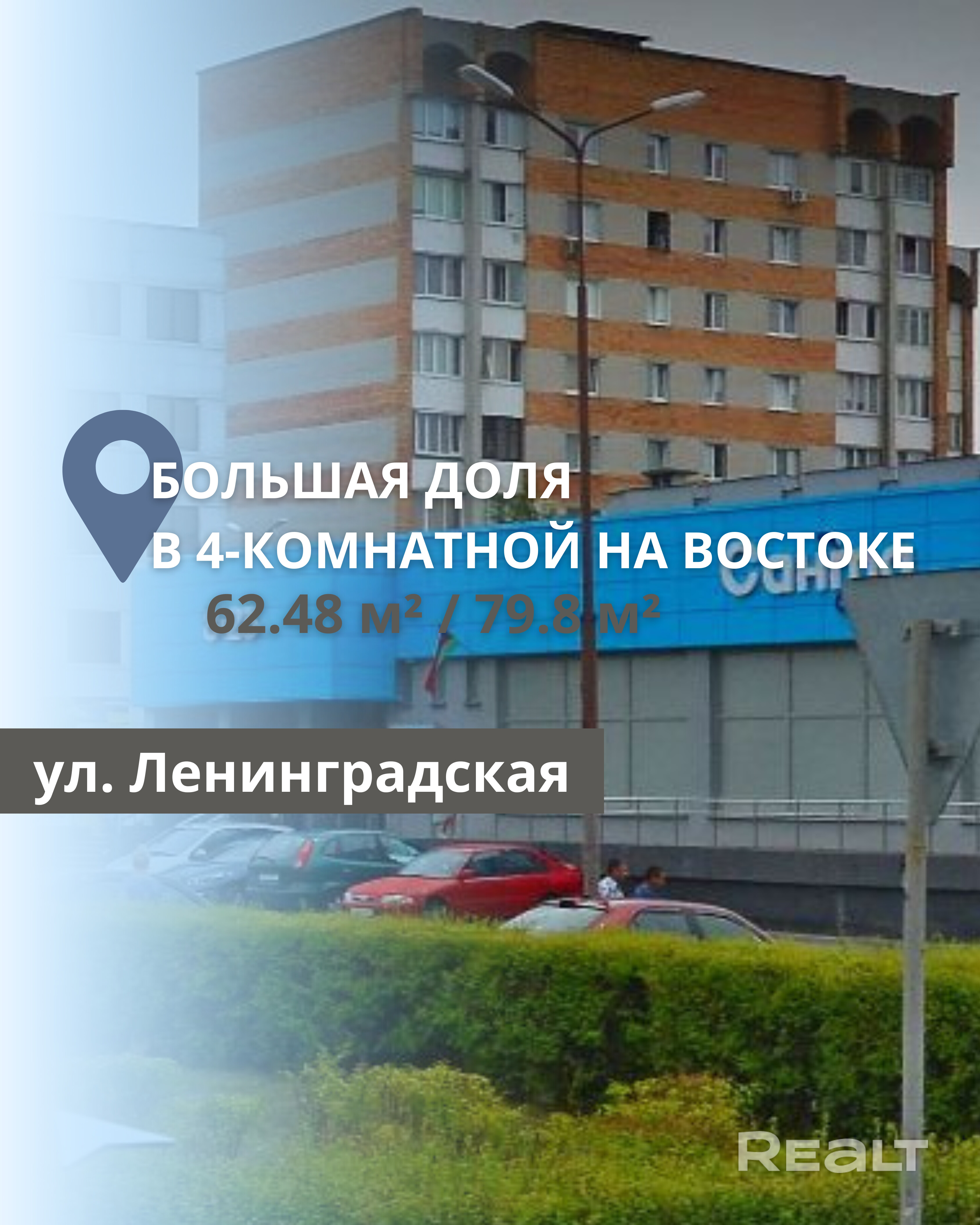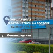 Продается доля 783/1000 в 4-комнатной квартире на востоке, расположенной по адресу ул. Ленинградская. Квартира находится на 3 этаже 9-этажного кирпичного дома, построенного в 1990 году. Общая площадь составляет 79,8 (СНБ)/74,4 кв.м, из которых жилая площадь – 48,6 кв.м, а кухня – 7,0 кв.м. В квартире имеются четыре жилые комнаты, кухня, коридор, раздельный санузел, кладовая и две лоджии. Выполнен ремонтом, установлены кондиционеры для комфортного проживания. Доля готова к быстрой продаже.