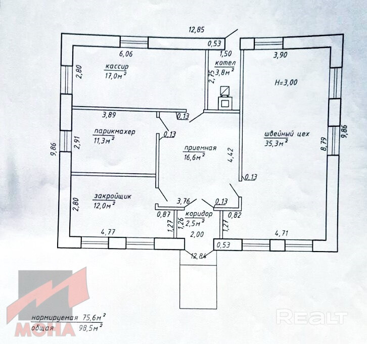 Общая площадь строения 98,5 м2, нормируемая 75.6 м,