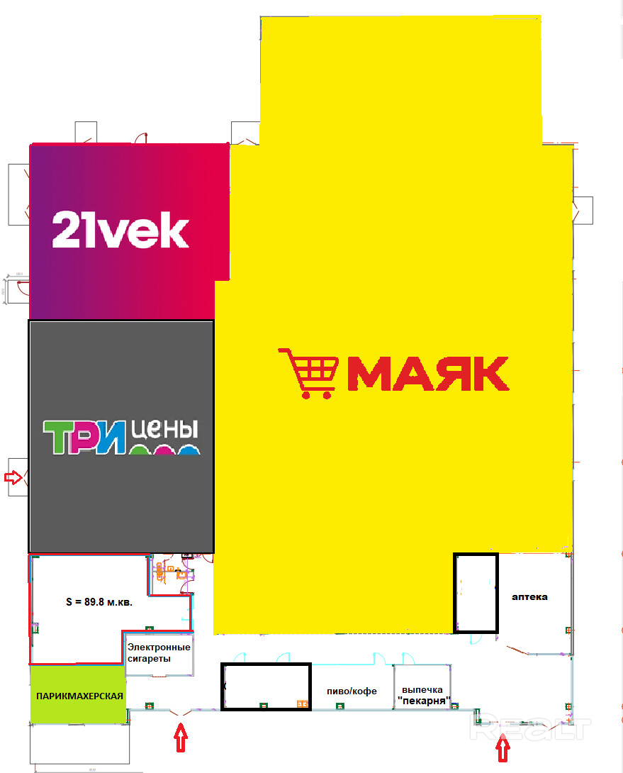 Продается коммерческое помещение площадью 89,8 м² в прикассовой зоне одноэтажного торгового центра (2050 м²). Якорный арендатор ТЦ - продовольственный дискаунтер "Маяк", формирующий стабильный ежедневный покупательский трафик 7 дней в неделю. В торговом центре работают: 21Век, ТриЦены, Аптека, Выпечка, Разливное пиво, Кофе, Электронные сигареты, Парикмахерская, Цветы.