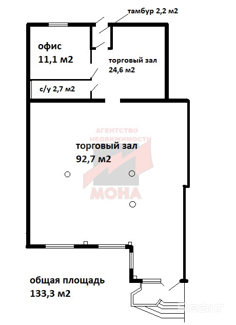 Общая площадь помещения 133,3 м2; площадь торгового зала 117,3 м2.