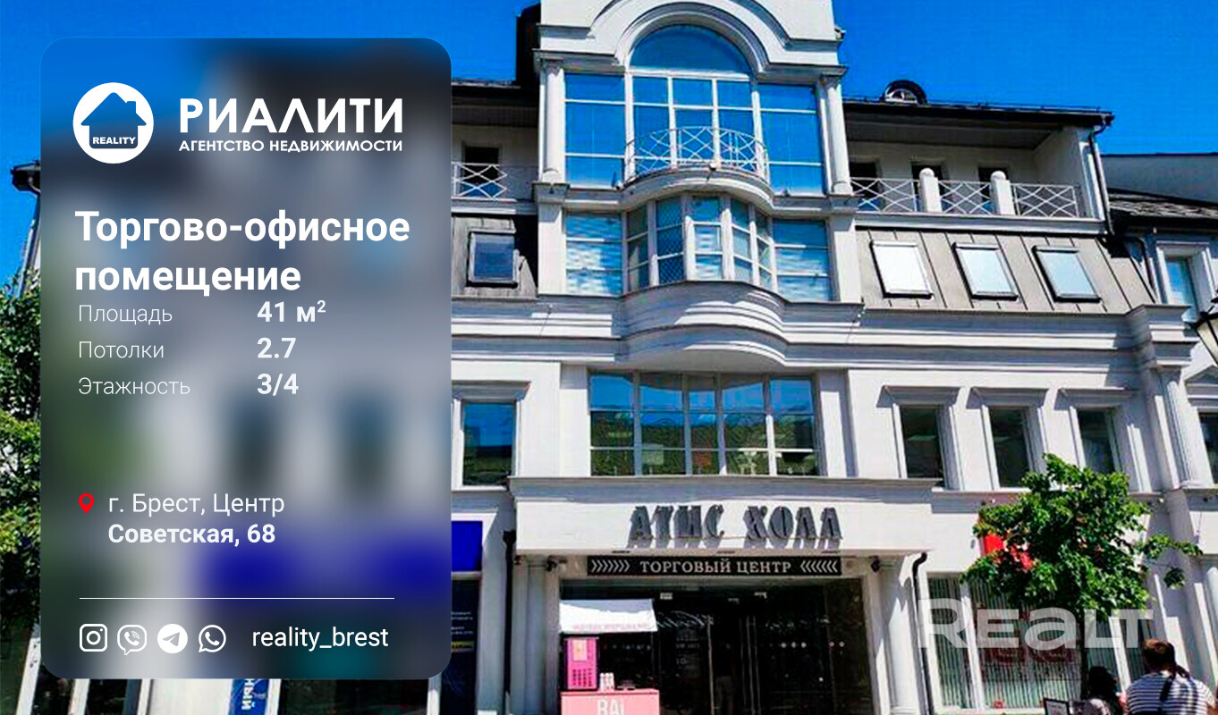 ПРОДАМ Торгово -офисное помещение ЦЕНТР Брест ТЦ "Атис Холл", ул. Советская 68, Площадью 41 кв.м. Высокий трафик, парковка, 3-й этаж, назначение – Административно – торговое помещение, наименование – Изолированное помещение. Характеристики: наружные стены - ж/б каркас с заполнением ячеистые блоками, облицованными кирпичом; внутренние стены кирпич, перекрытия – плита ж/б, полы – плитка, стены оштукатурены/окрашены, окна ПВХ профиль, централизованное электро-водоснабжение, вентиляция с естественным побуждением Стоимость помещения 69000 дол., НДС нет Узнавайте первыми о ПРОДАЖЕ коммерческой недвижимости в Бресте! Подписывайтесь наш телеграмм-канал: prodambre