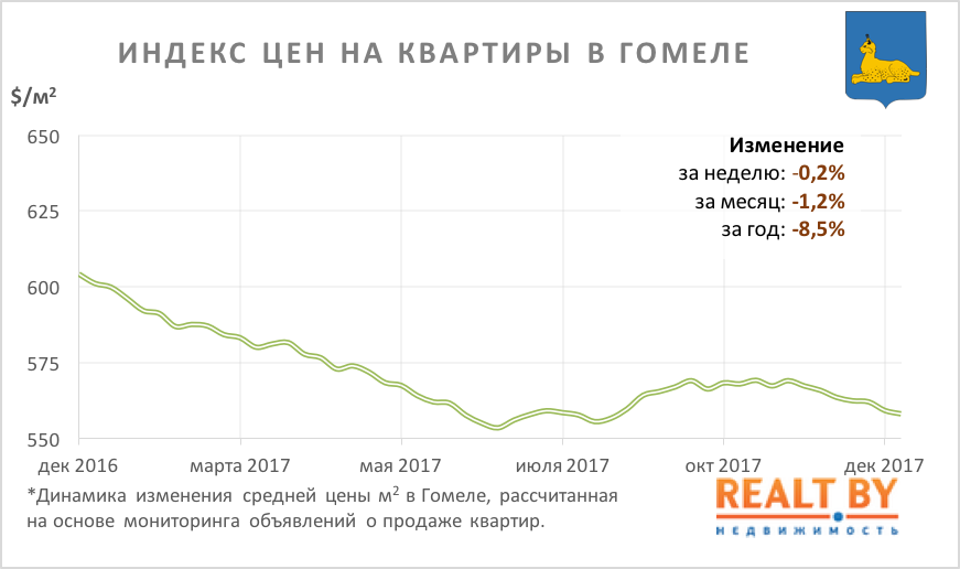 Средняя цена предложения в объявлениях о продаже квартир в Гомеле на минувшей неделе снизилась на 0,2% и составила 558 $/м2.